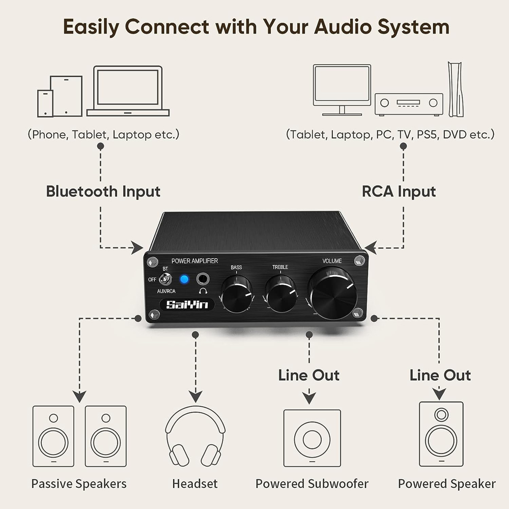 Saiyin Power Amplifier Home Audio, 80W x 2 Stereo Bluetooth Amplifier Receiver 2.0 Channel Mini Hi-Fi Class D Integrated Amp with Headphone Jack, Bass/Treble Control for Home Speakers